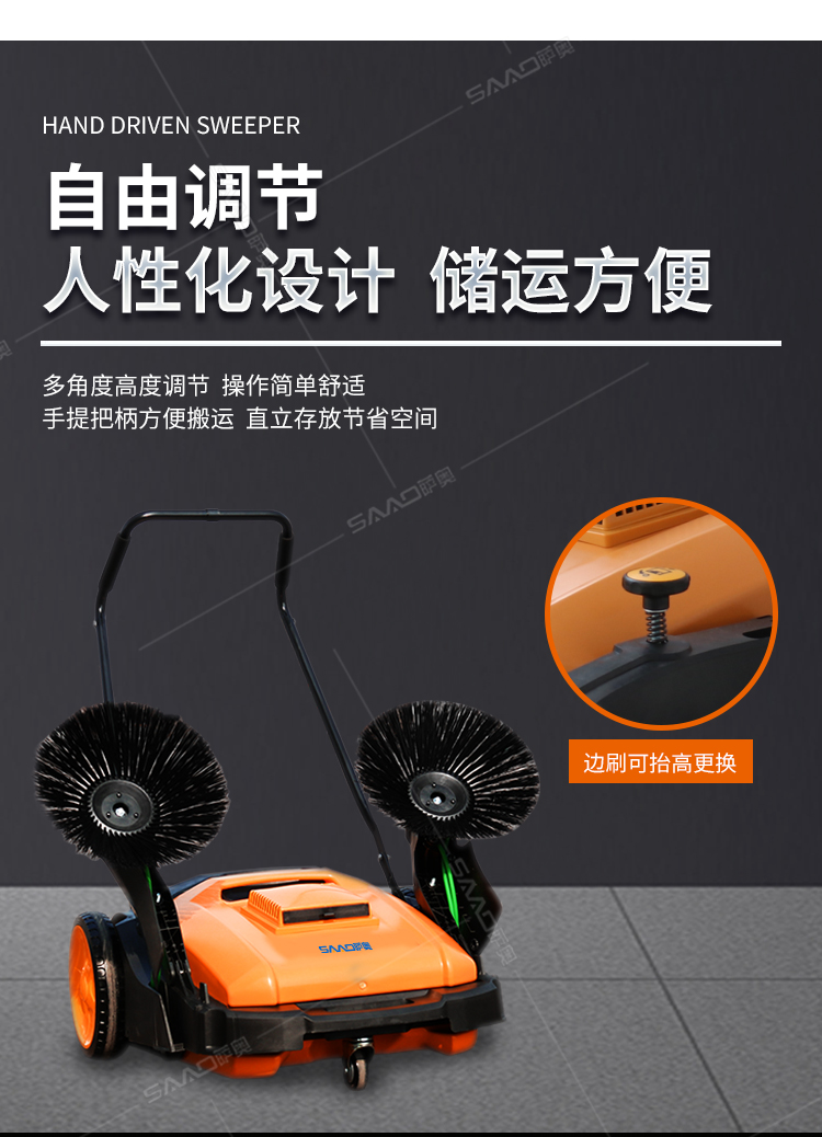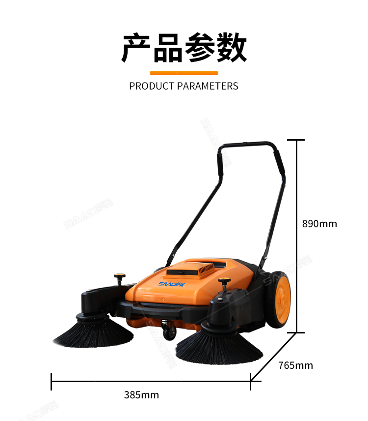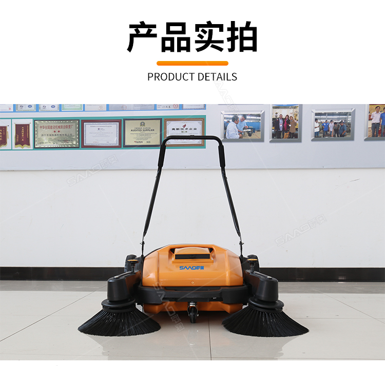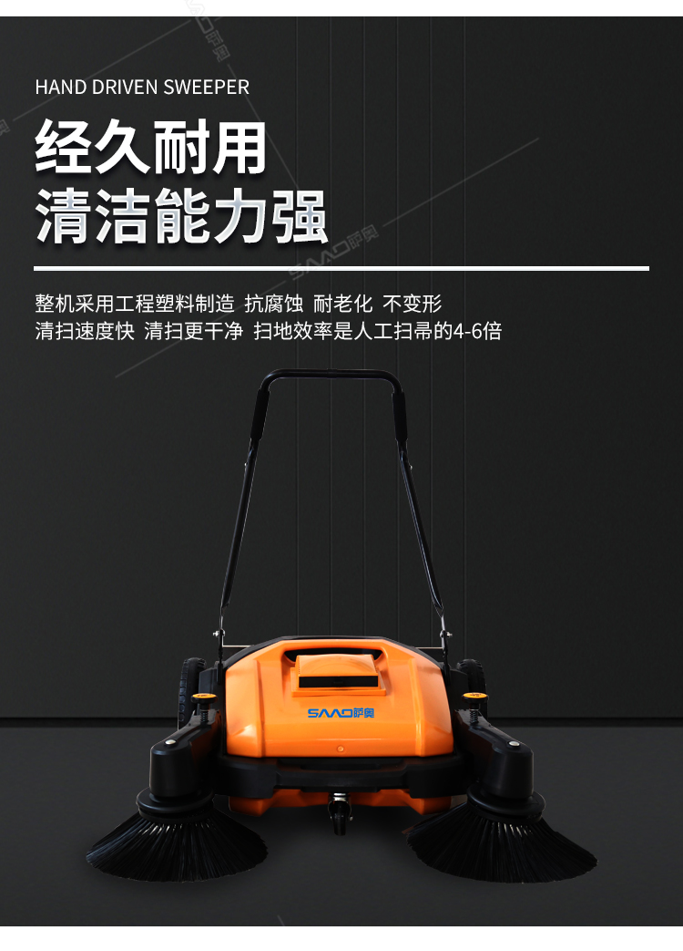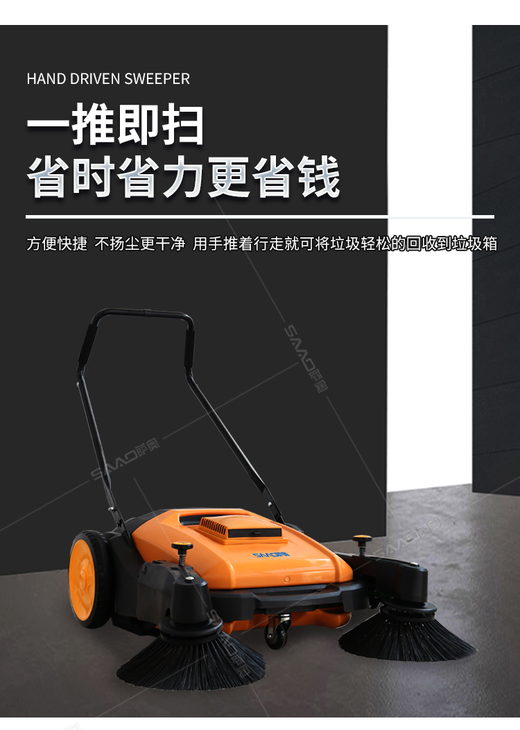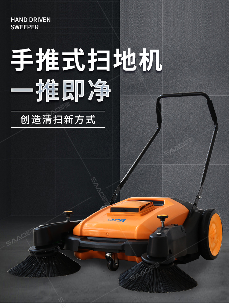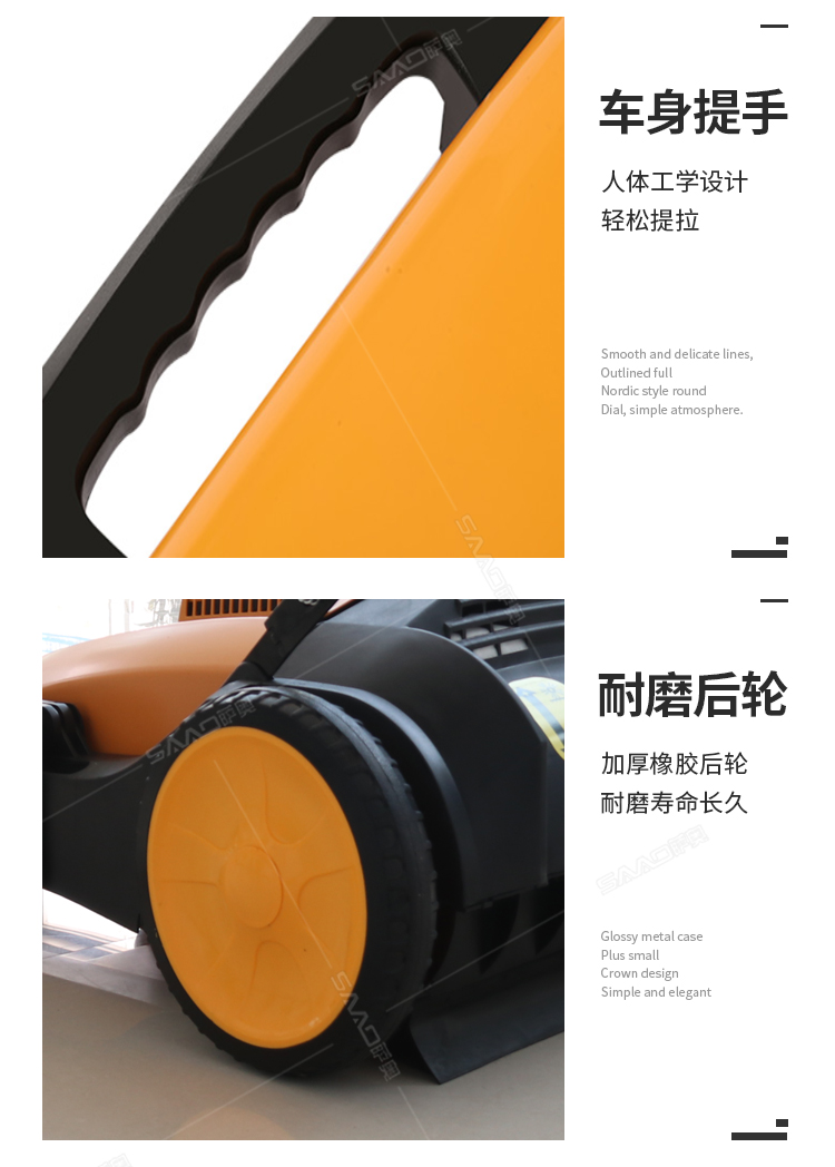 手推式掃地機能清潔房屋周邊范圍:包括小路,公路,車道和院子,能比用普通的掃把和簸箕節(jié)省5倍的時間,清掃時垃圾被迅速的收集到塵箱,簡單、快速、干凈。