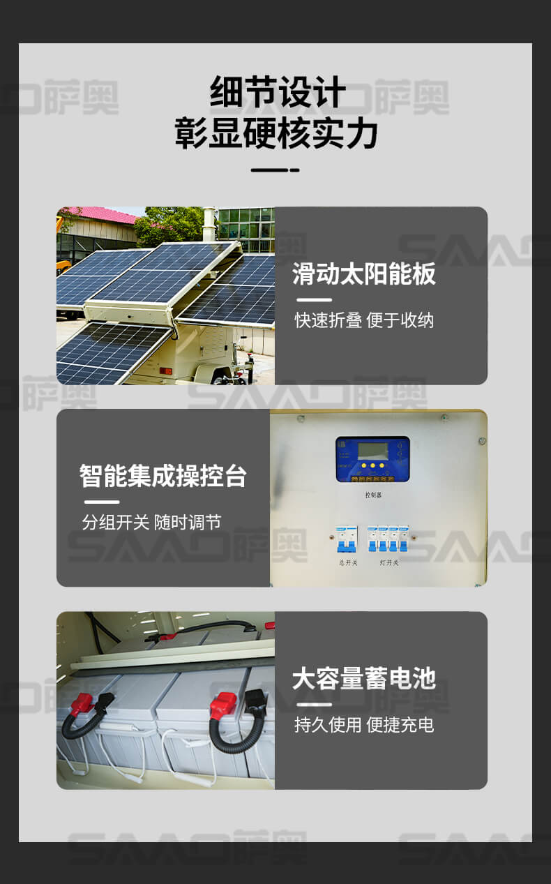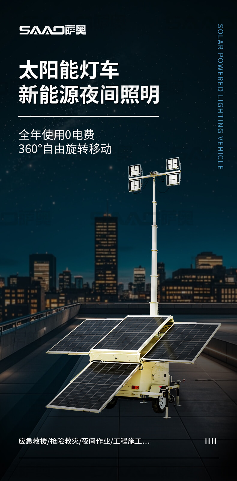 太陽能移動照明燈車適用于鐵路、電力、公安、消防、露天采礦等各種大型施工作業、事故搶修、搶險救災等工作現場對大面積高亮度照明的需要。