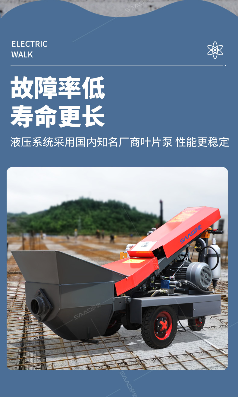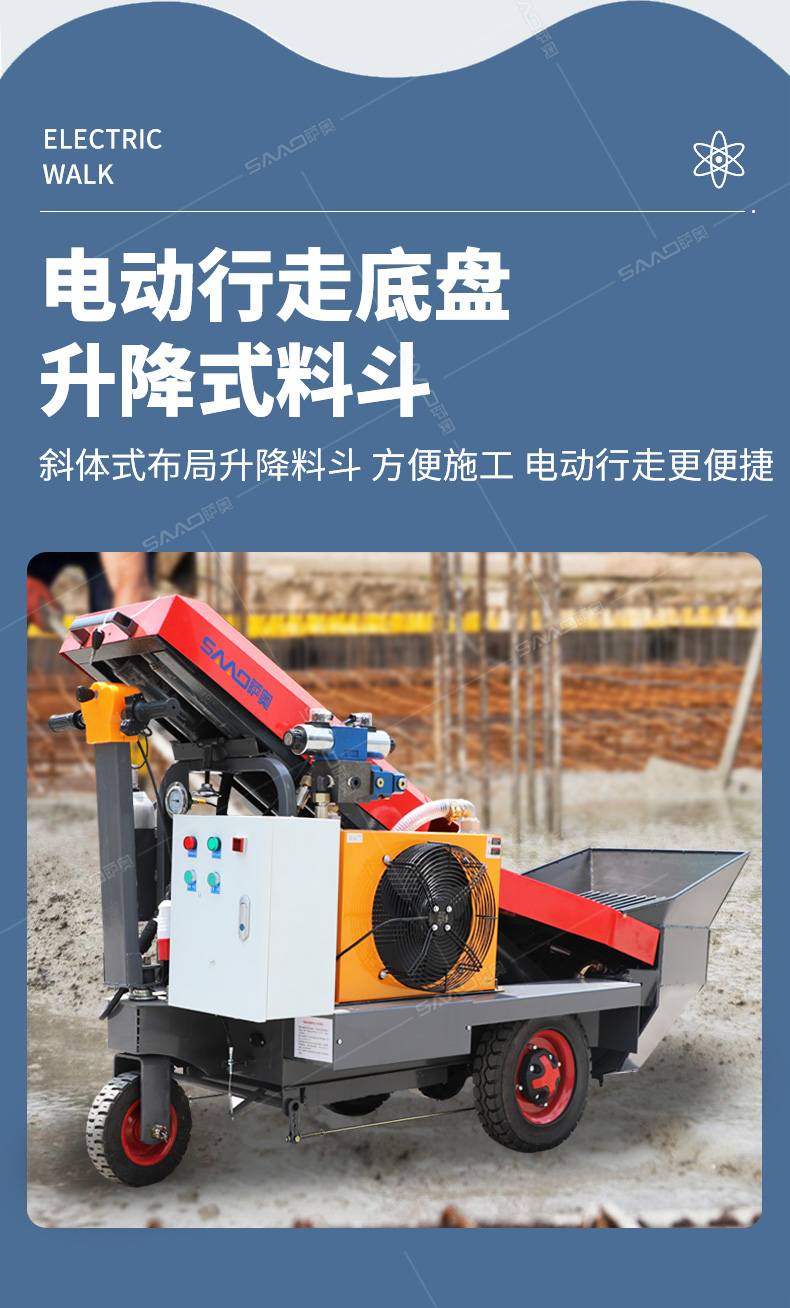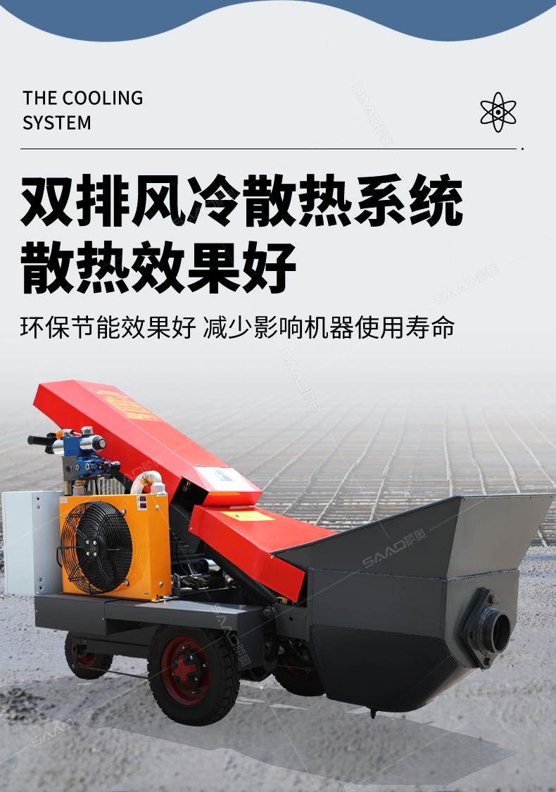 采用電動行走底盤,斜體式布局升降料斗,采用雙排風冷散熱系統散熱效果更好,液壓系統采用國內知名廠商葉片泵,故障率低,壽命更長,性能更穩定,超長行程料缸大大提高了輸送