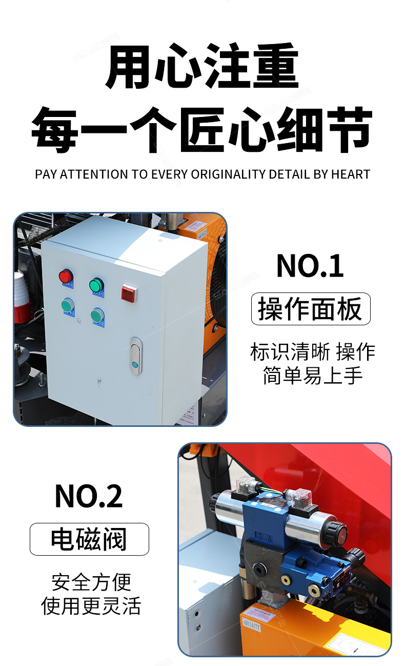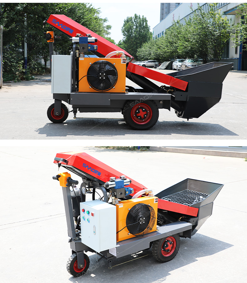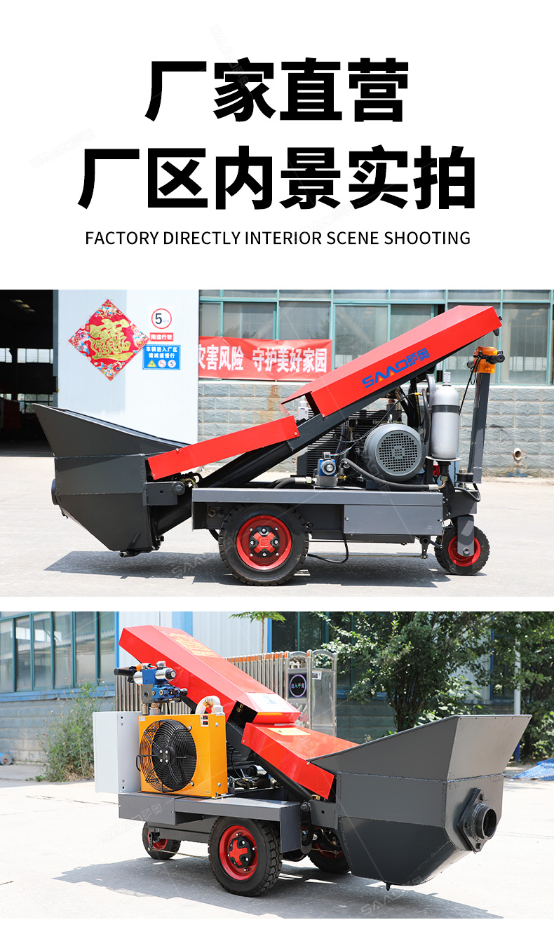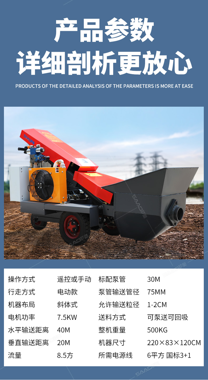 采用電動行走底盤,斜體式布局升降料斗,采用雙排風冷散熱系統散熱效果更好,液壓系統采用國內知名廠商葉片泵,故障率低,壽命更長,性能更穩定,超長行程料缸大大提高了輸送