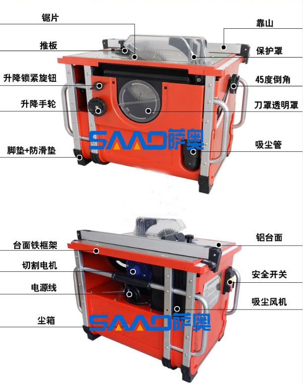 1、 鋸片采用齒輪升降調節功能,可切割不同厚度木制品和割槽能力,而且更有效的提高了吸塵效果;