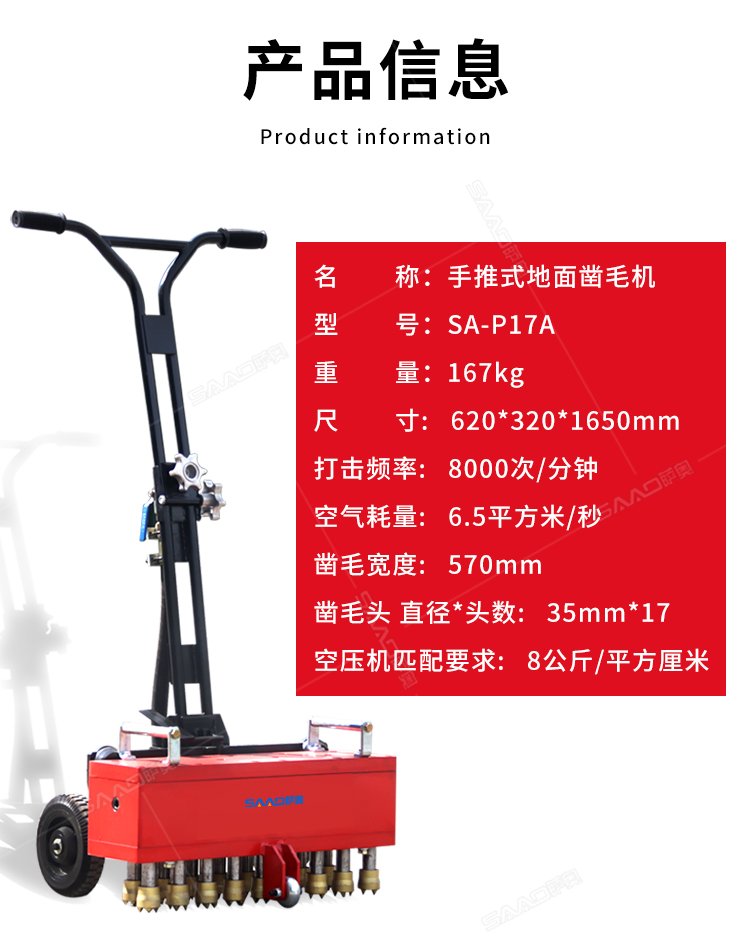 手推式地面鑿毛機,主要為高速公路、高速鐵路的橋面、機場、橋梁、停車場等各種混凝土地面新建鋪裝時對地面表層混凝土浮漿的去除,達到均勻粗糙而設計的。對各種陳舊地面做翻