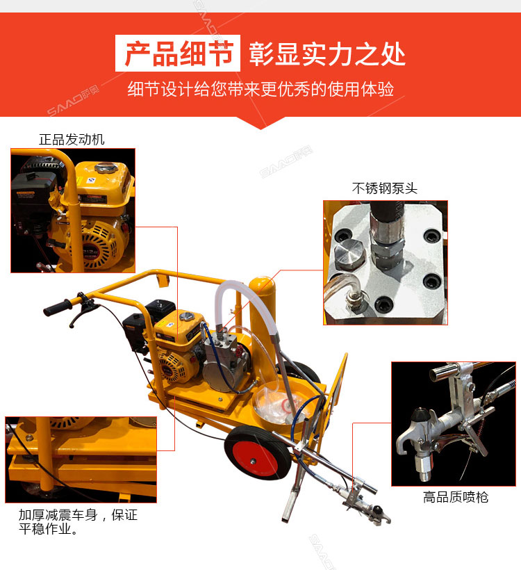 冷噴劃線機是常溫標線施工的專用設備,噴出的線型清晰、流暢、飽滿、均勻,主要用于公路、停車場、機場、加油站、公司廠區等涂畫直線、虛線、曲線、斑馬線、文字、箭頭、圖形