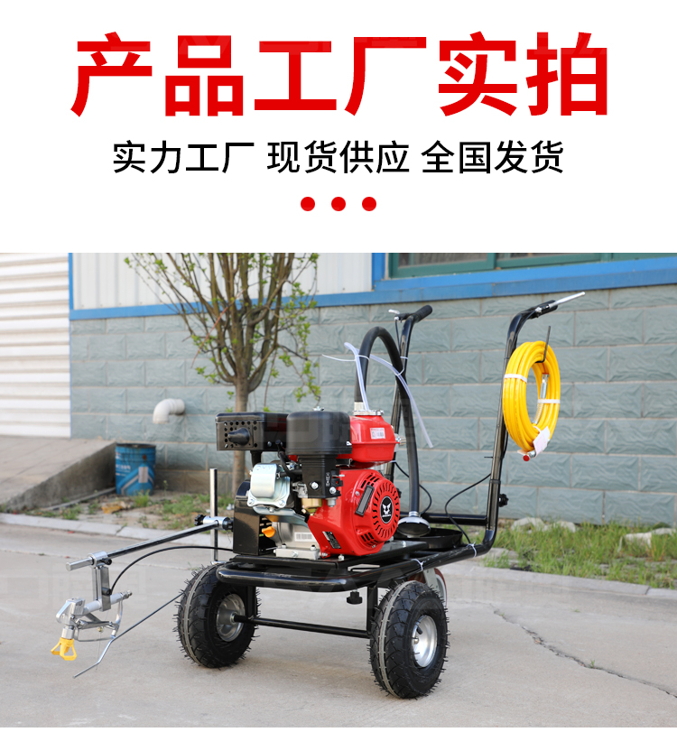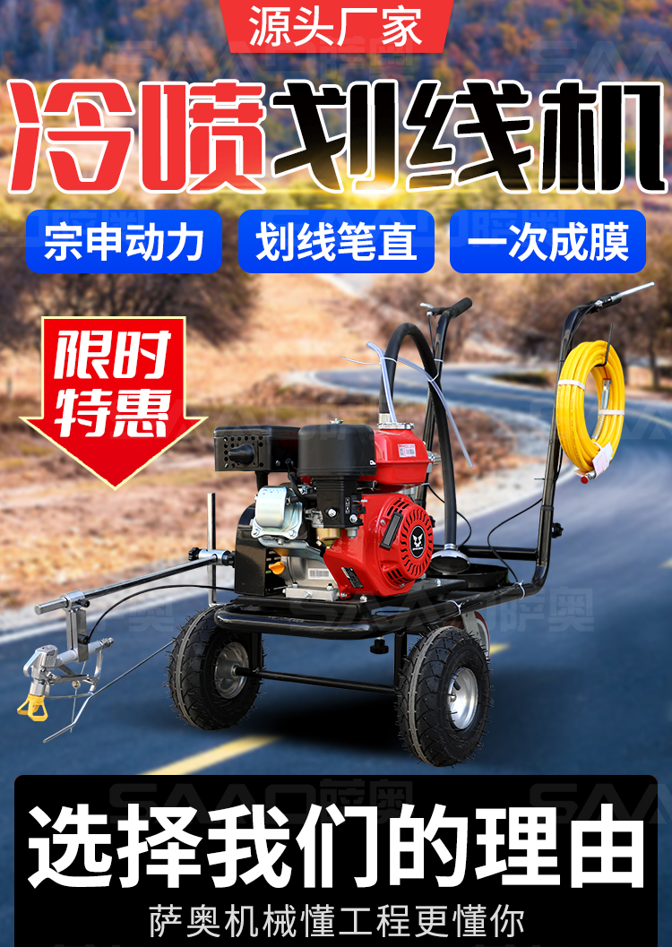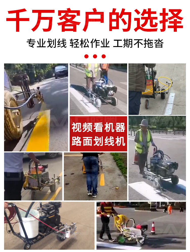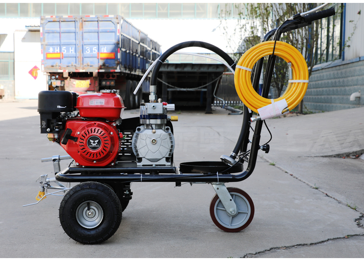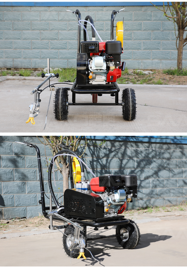 冷噴劃線機是常溫標線施工的專用設備,噴出的線型清晰、流暢、飽滿、均勻,主要用于公路、停車場、機場、加油站、公司廠區等涂畫直線、虛線、曲線、斑馬線、文字、箭頭、圖形
