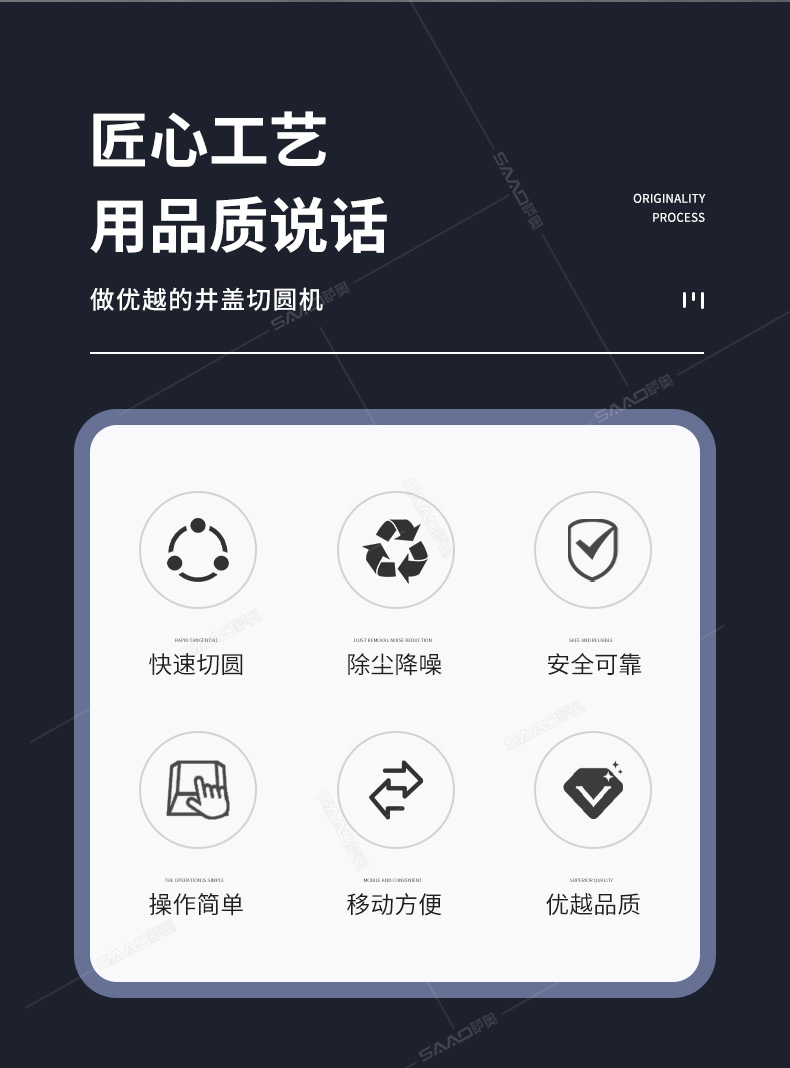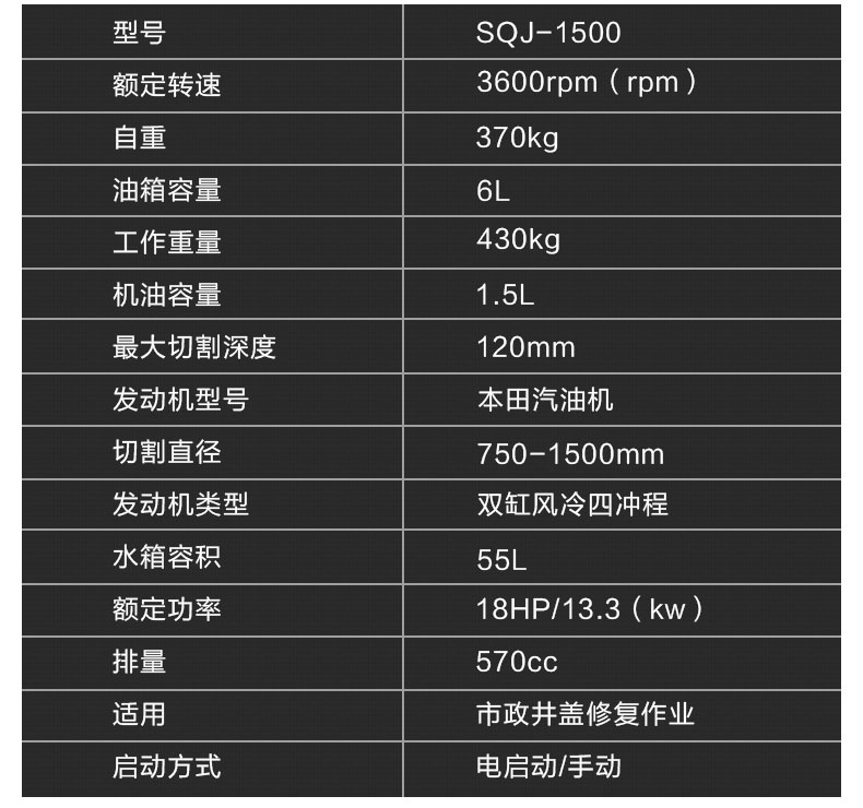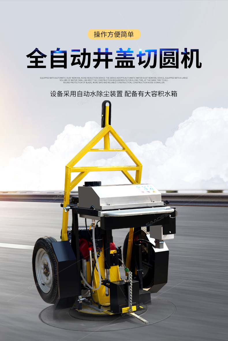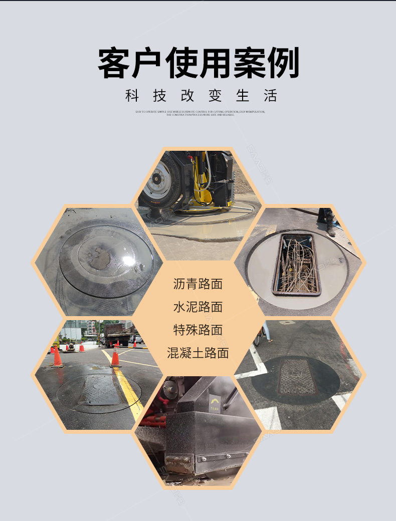 SQJ-1500型井蓋切割機,專門用于對城市道路中機動車道等井蓋周圍的水泥混凝土或瀝青路面進行圓形切割。為清楚井蓋周圍的破損路面提供分割區域,修復后的地面美觀,延長了路面的使用壽命。