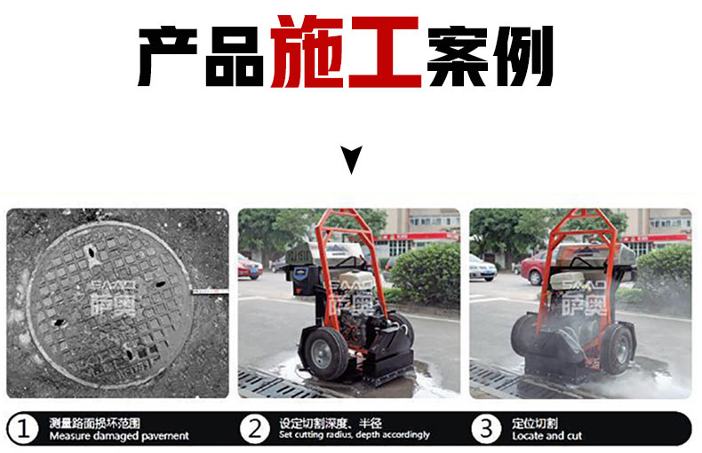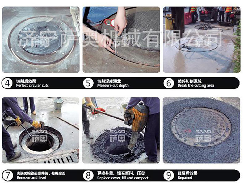 SQJ-1500型井蓋切割機專門用于對城市道路中機動車道等井蓋周圍的水泥混凝土或瀝青路面進行圓形切割。為清楚井蓋周圍的破損路面提供分割區域,修復后的地面美觀,延長了路面的使用