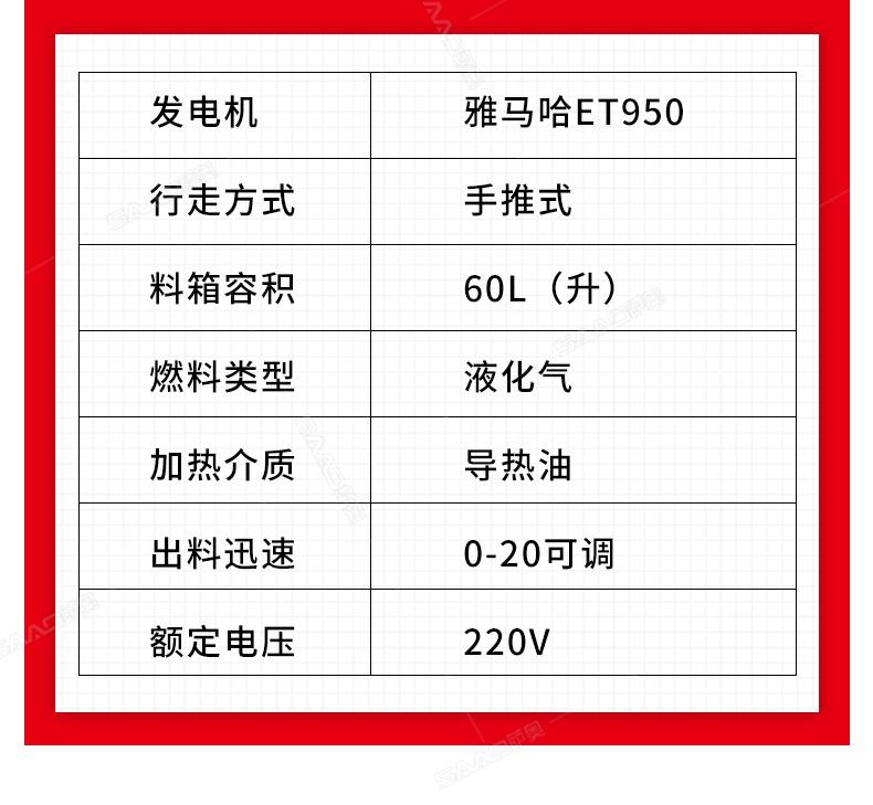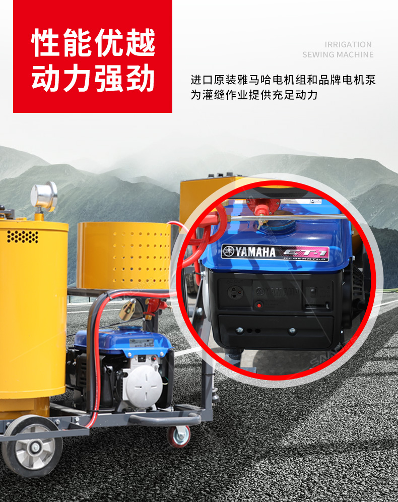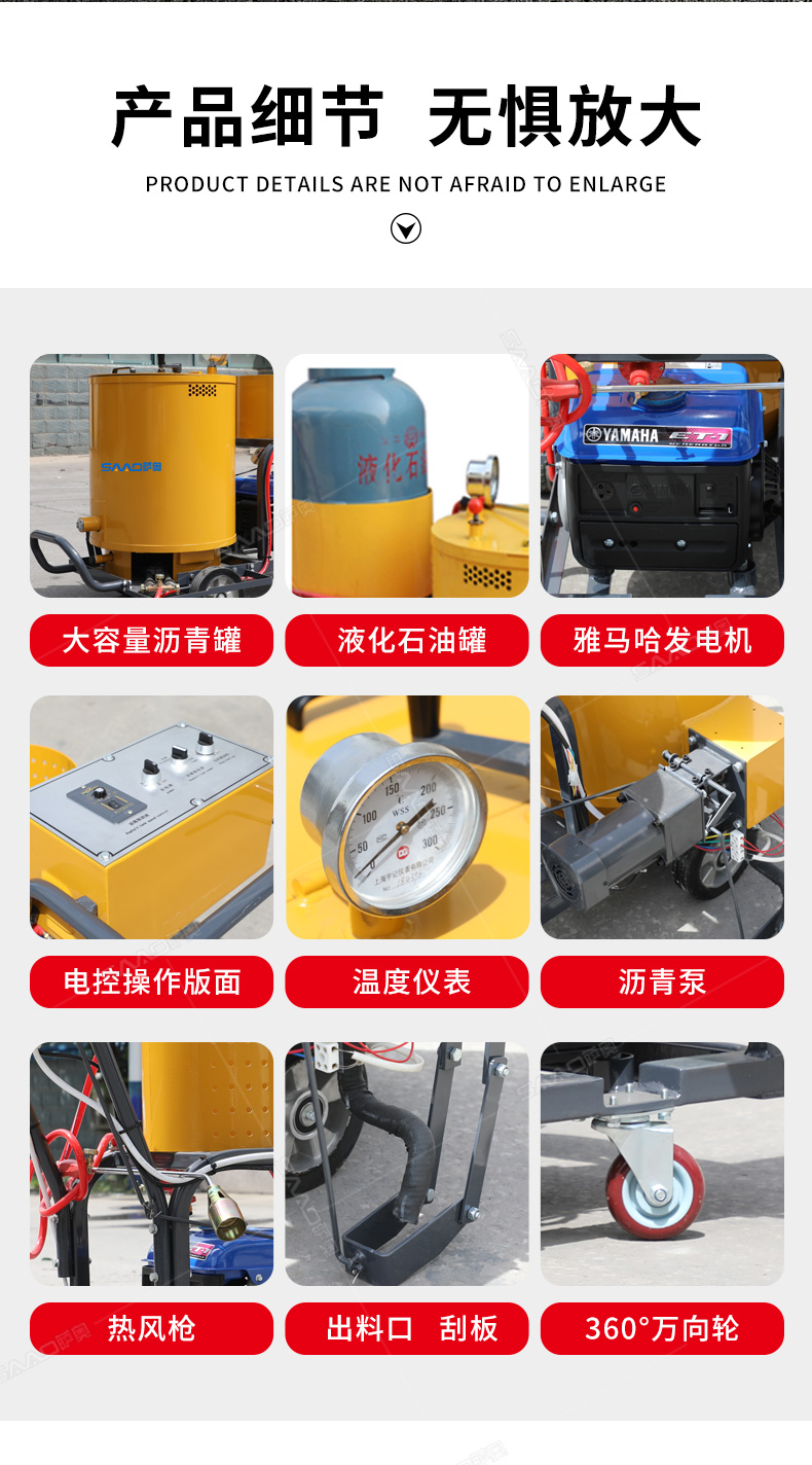 產(chǎn)品簡(jiǎn)介: 用于瀝青或水泥路面裂縫瀝青灌縫。 產(chǎn)品型號(hào):SGF-60 產(chǎn)品技術(shù)參數(shù): 發(fā)電機(jī)型號(hào) ET950 行走方式 手推式 料箱容積 60L 燃料類型 液化氣 加熱介質(zhì) 導(dǎo)熱油 出料速度 0-20可調(diào)