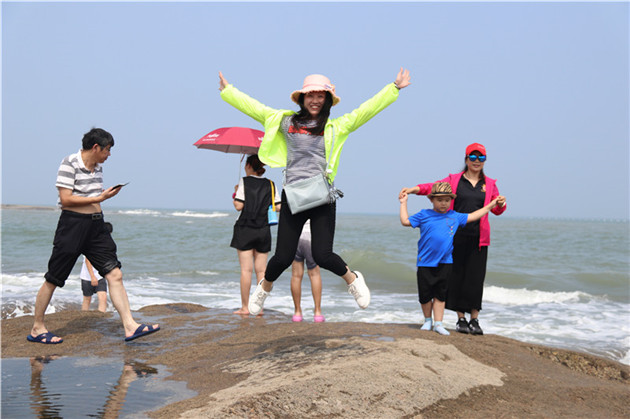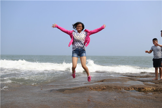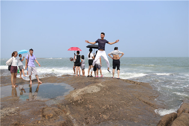 在海礁石上,迎著海浪沖擊,面對大海吶喊,進(jìn)一步的與大海交流。激動的大家一蹦三尺高。