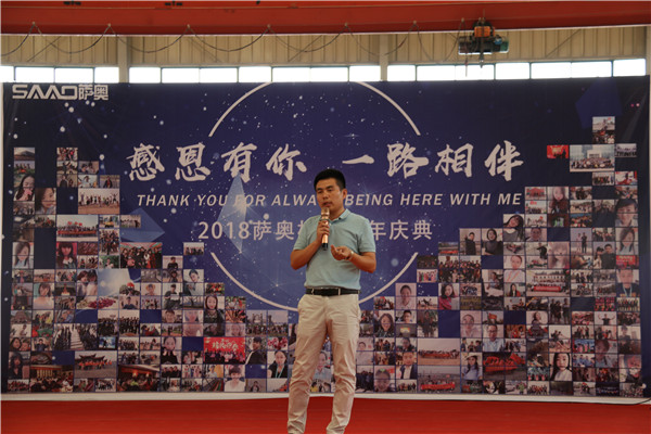 薩奧創始人兼總經理韓廣非先生為薩奧周年典慶致辭。他說:自薩奧成立以來,不斷的在突破,在提高,公司的業績每年都能夠翻倍,直到今天,公司業績達到了大家以前想都不敢想的高度。這其中離不開每一個成員的努力。同時也證明了,這個世界上沒有做不到,只有想不到。大家要團結起來,力往一起使,提高自己的經濟收入,從而提高自己的家庭地位。