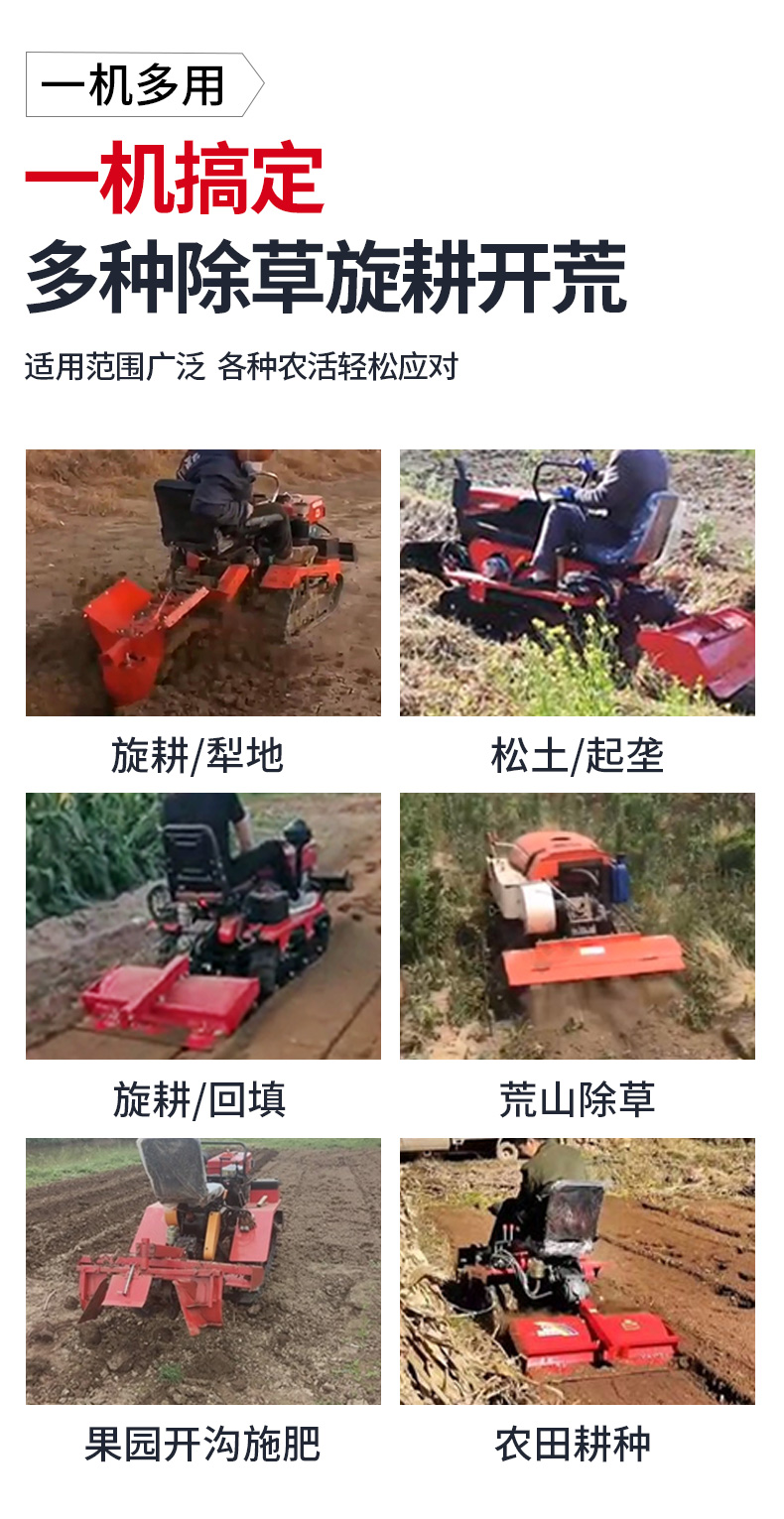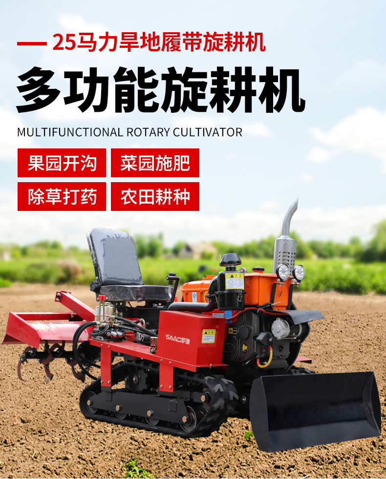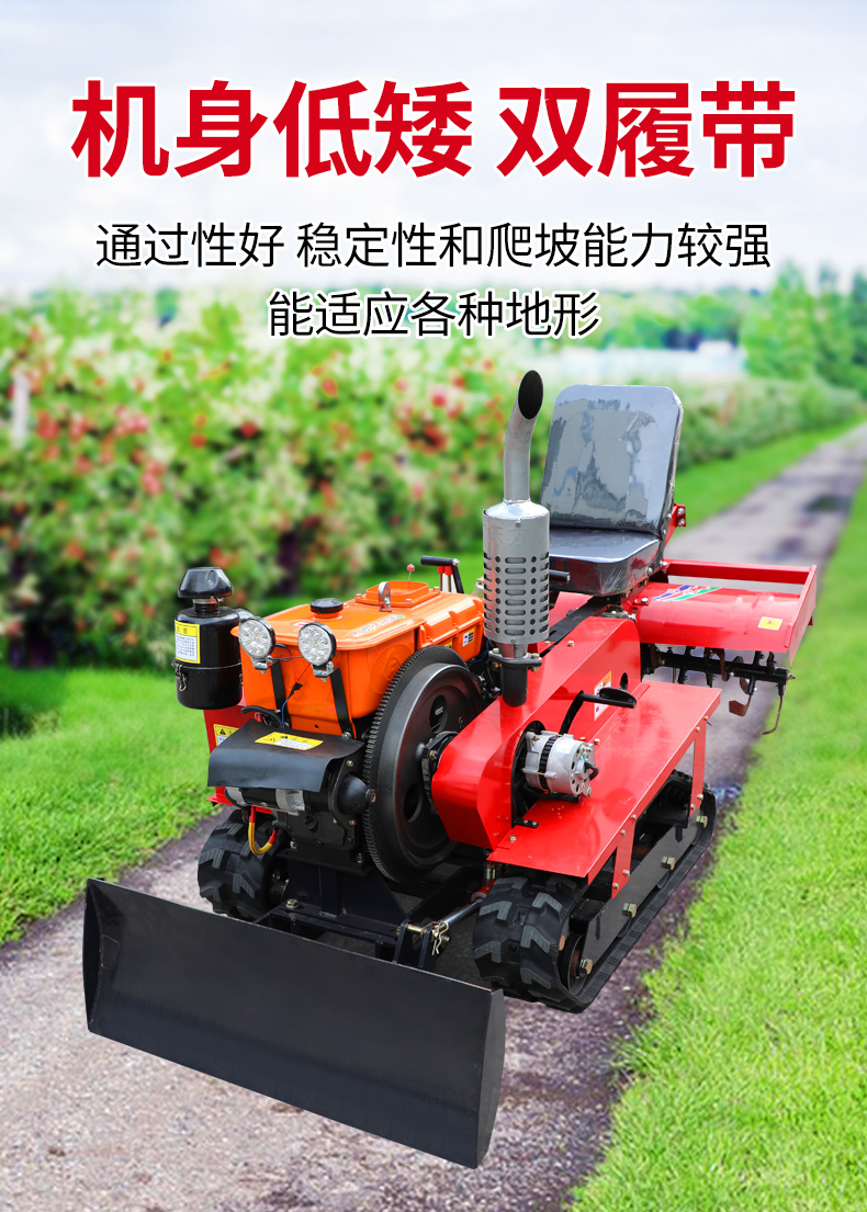 25馬力旱地履帶旋耕機適用于大面積、小面積清除雜草,適用于果園、農田、玉米地、山地的除草作業,打藥/旋耕/犁地/開溝施肥/回填/除草/起壟都可以。