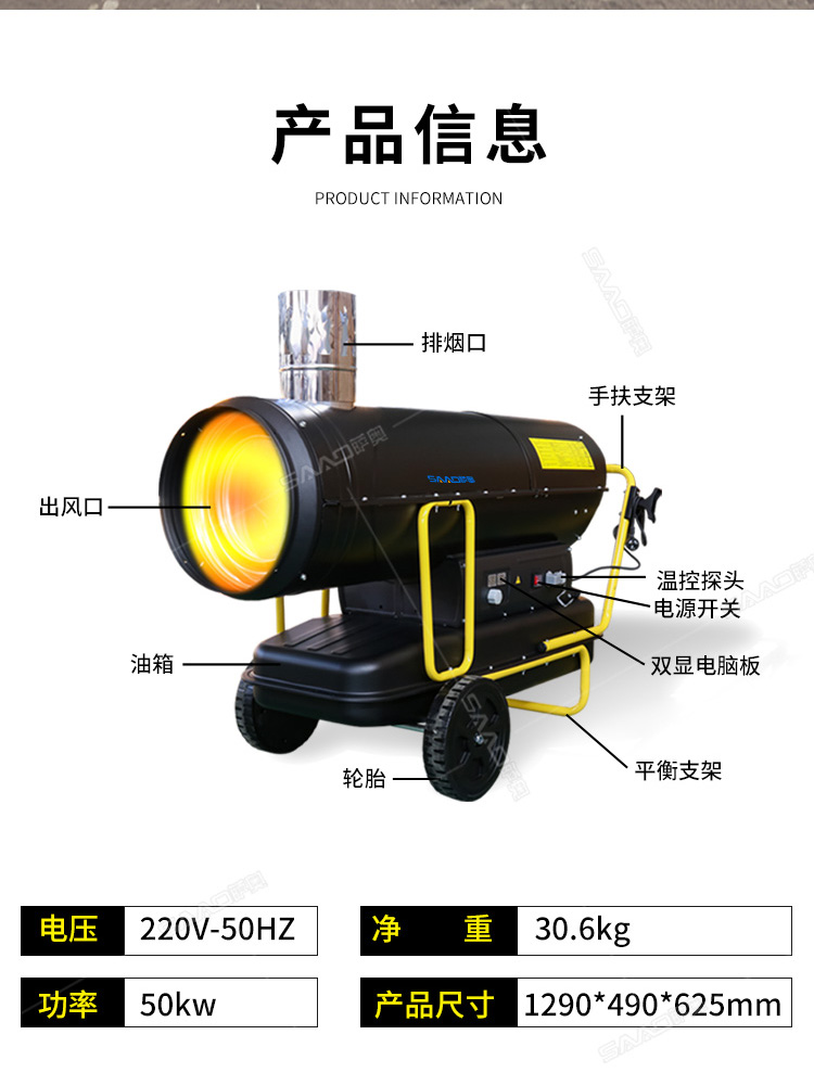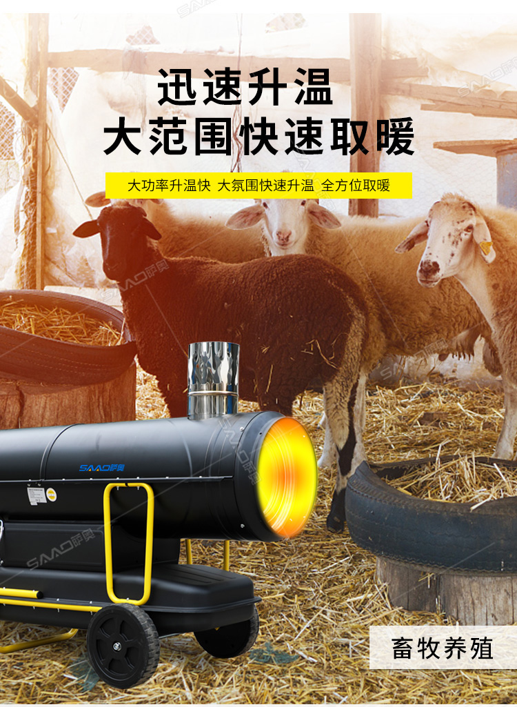 間燃暖風機的應用范圍可以說是非常廣泛的,主要可以應用于大棚育植、食品烘干、茶葉烘干、育雛養殖、 木材解凍、戶外演出等需要供暖供熱的場所,此外,配有光電保護裝置、結構