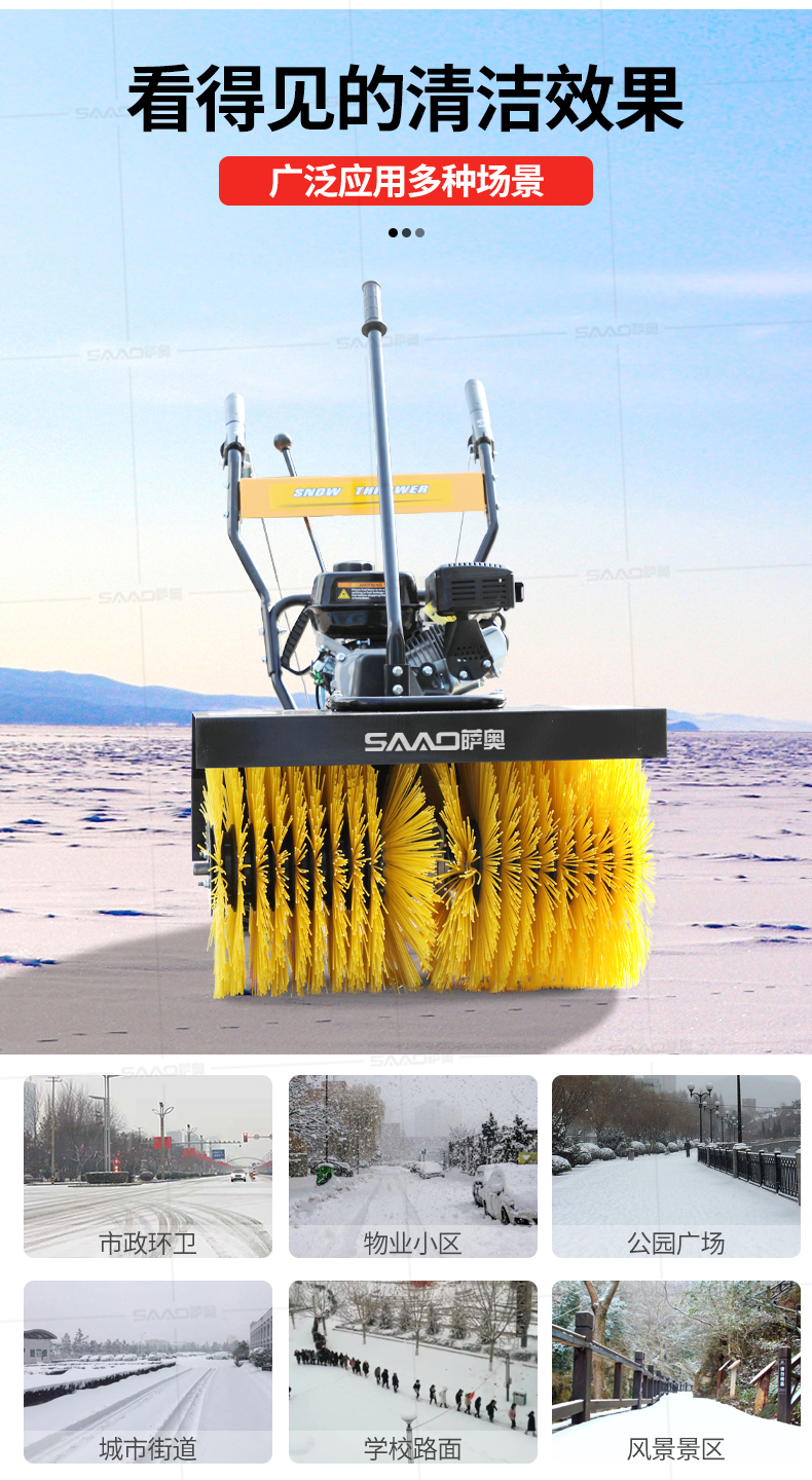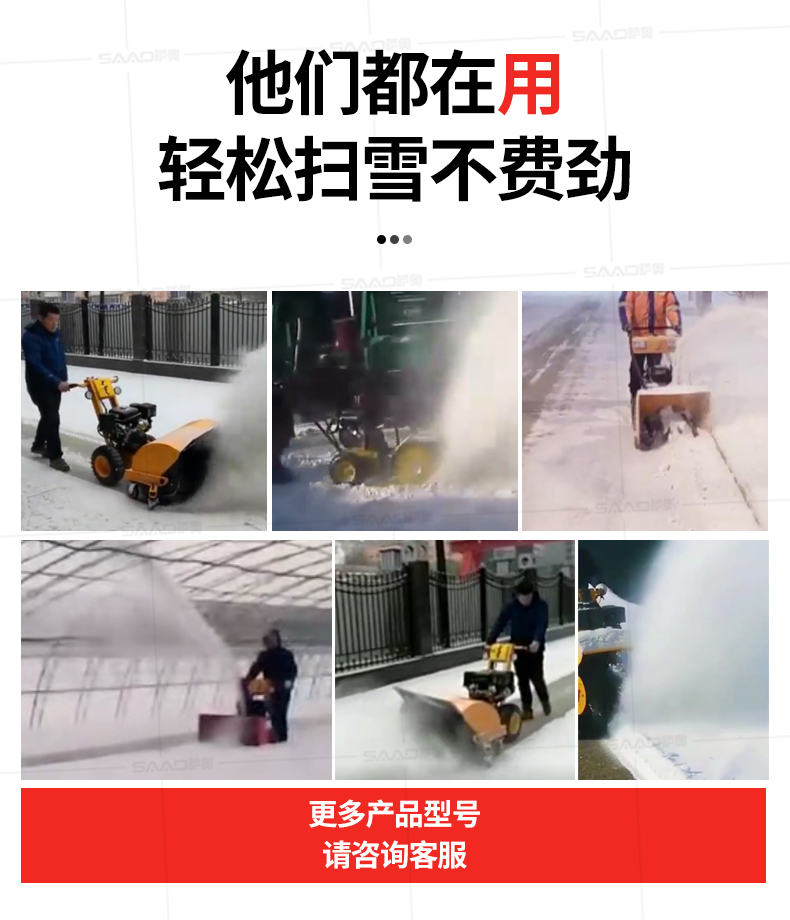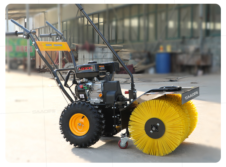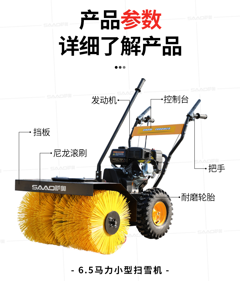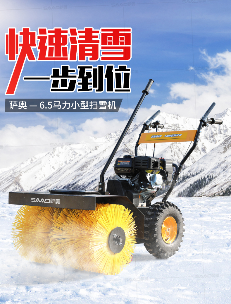 小型掃雪車由中型卡車或重型卡車、四缸汽車發動機、吸 雪管、鼓風機、排雪管、吸雪口、吸雪口液壓升降裝置、 旋轉式清掃刷、清掃刷連桿、固定架、 清掃刷液壓